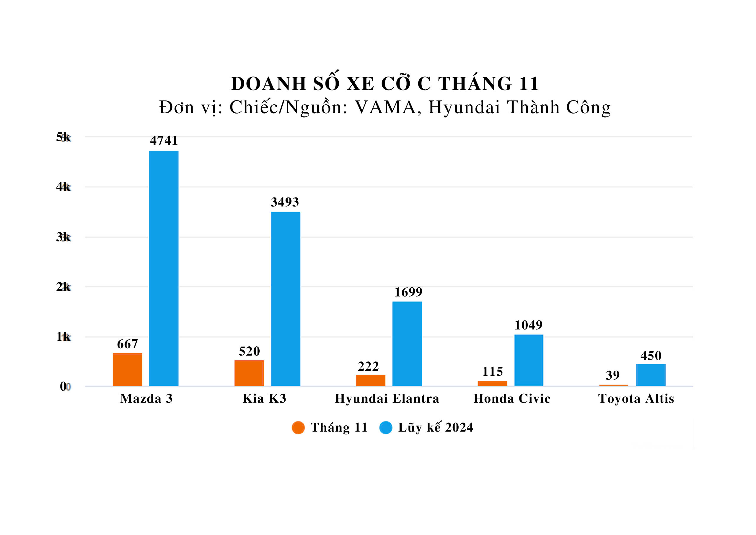 Hyundai Elantra tiếp tục duy trì vị trí thứ ba trong phân khúc sedan cỡ C với 222 xe được giao đến khách hàng, chỉ tăng nhẹ 4 chiếc so với tháng trước. Honda Civic, mẫu xe nhập khẩu, giữ vững vị trí thứ tư với 115 xe bán ra, và đặc biệt ghi nhận mức tăng trưởng ấn tượng hơn 125% trong tháng 11. Trong khi đó, Toyota Corolla Altis, mẫu xe nhập khẩu còn lại, tiếp tục đứng cuối phân khúc với 39 xe giao đến tay khách hàng, giảm mạnh 29% so với tháng trước, đánh dấu biên độ giảm doanh số cao nhất trong tháng.
