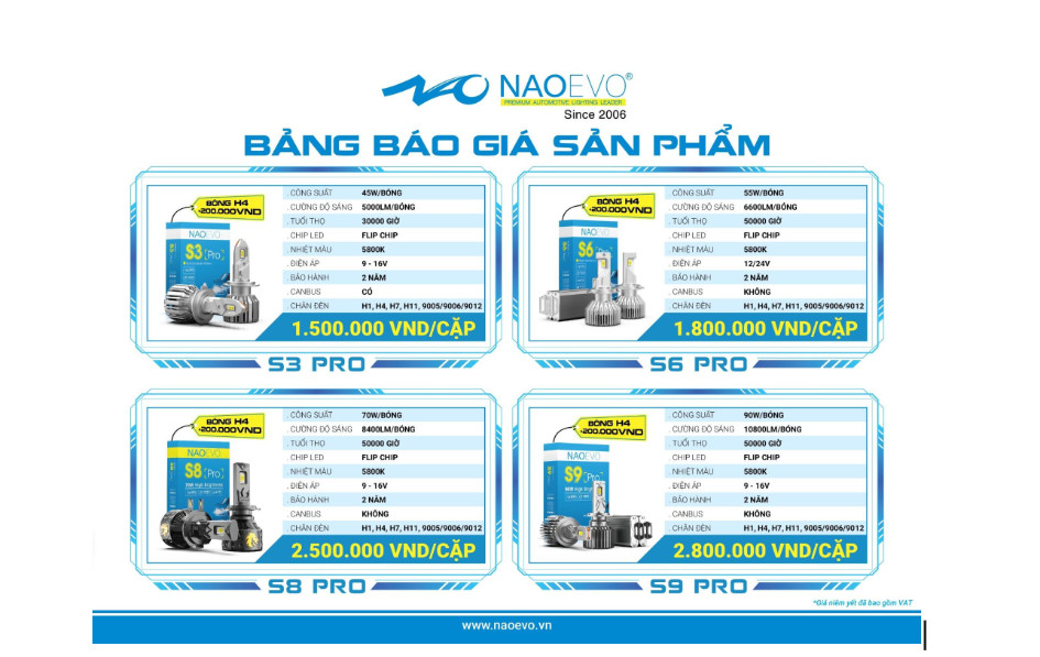 Naoevo tự hào cung cấp các sản phẩm bóng đèn LED Naoevo cao cấp như Naoevo S3 Pro, Naoevo S6 Pro, Naoevo S8 Pro, và Naoevo S9 Pro. Các sản phẩm này đều trang bị chip LED cao cấp, độ sáng vượt trội, tiết kiệm năng lượng và tuổi thọ cao. Naoevo cam kết cung cấp 100% sản phẩm chính hãng với nguồn gốc rõ ràng và đa dạng các loại chân đèn như H1, H4, H7, H11, 9005/9006/9012.